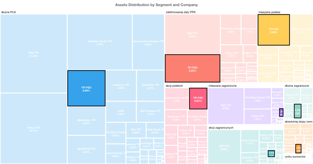 Mapa aktywów TFI to narzędzie, które stworzyłem w Chart.js z pomocą Claude Code. Obrazuje rozkład aktywów polskich TFI z podziałem na segment, firmę (wersja 2-poziomowa) i dodatkowo poszczególne fundusze (wersja 3-poziomowa). Obie wersje znajdziesz na mojej anglojęzycznej stronie: