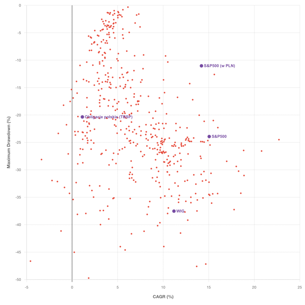 Mapa wyników TFI to 2-wymiarowa mapa obrazująca średnioroczny wynik (CAGR, na osi poziomej) kontra największe obsuniecie w tym czasie (maxDD, na osi pionowej) wszystkich funduszy w Polsce.